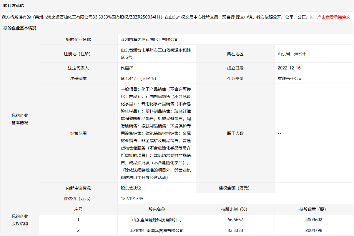 萊州市海之運(yùn)石油化工有限公司33.3333%國(guó)有股權(quán)