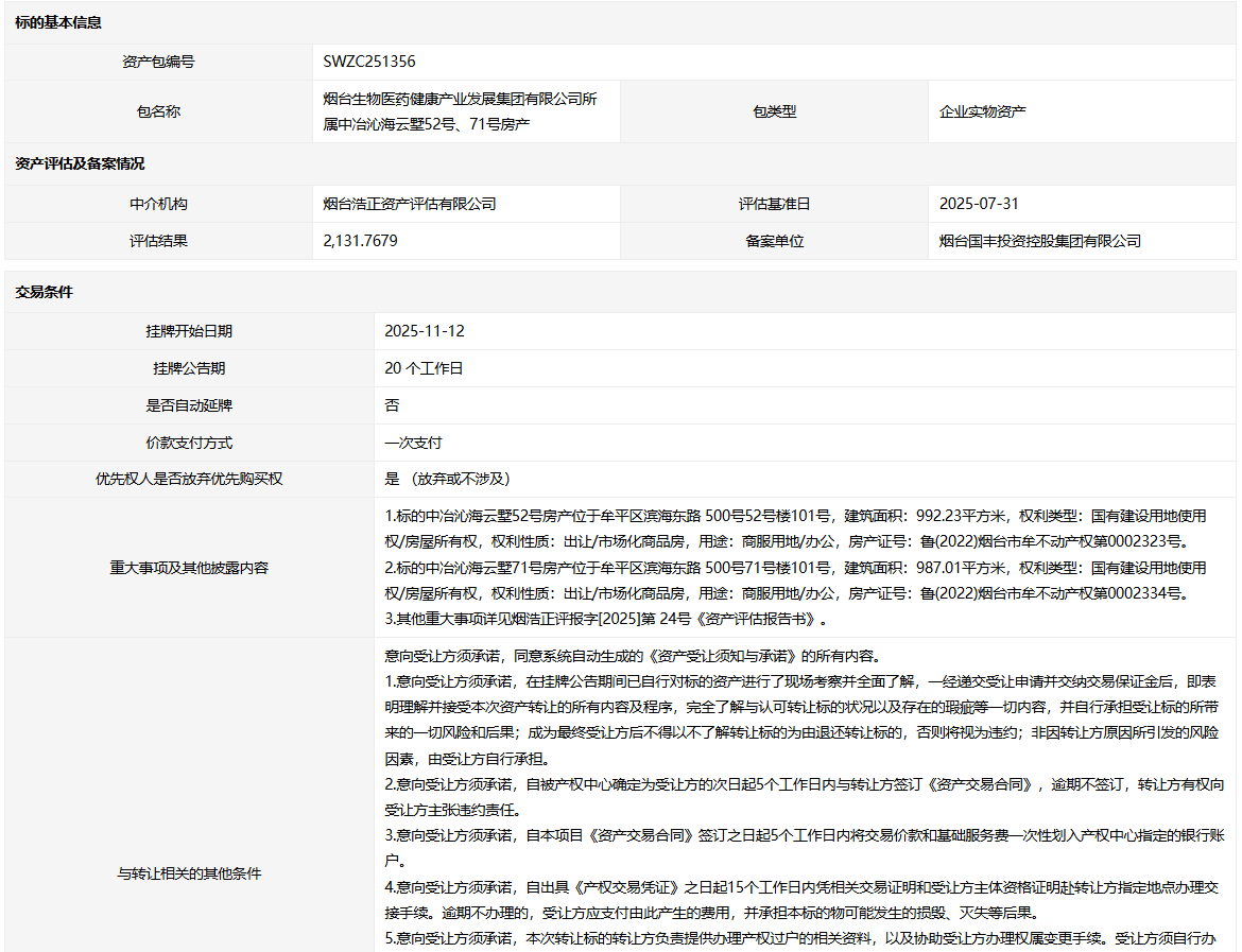 轉(zhuǎn)讓方:煙臺生物醫(yī)藥健康產(chǎn)業(yè)發(fā)展集團(tuán)有限公司